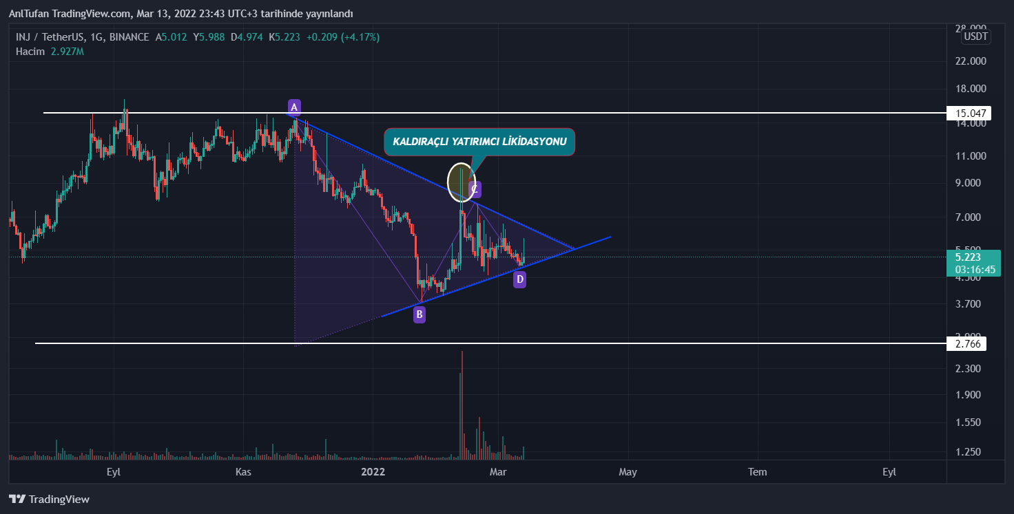 Formasyonu aşağı yönlü kırmasının ardından 2.75 dolar seviyelerine bir düşüş yaşayabilecek olan INJ, yukarı yönlü bir kırılımın ardından ise kısa sürede 15 doları görebilir.