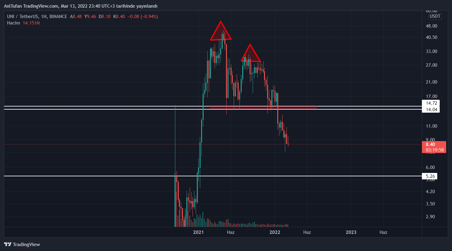 Haftalık grafik üzerinden incelediğimiz takdirde, 2’li tepe oluşturmuş olan UNI, boyun çizgisi olan 14 doların kırılmasıyla birlikte düşüşüne başladı.