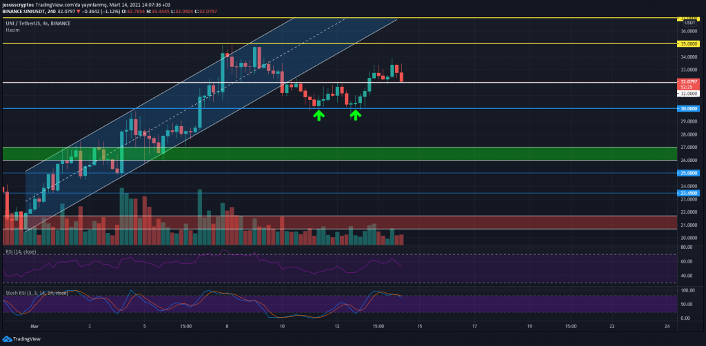 Diğer birçok altcoinde olduğu gibi UNI’de de 28 Şubat tarihinden bu yana bir yükselen kanal görünümü mevcuttu. Ancak 4 saatlik grafik üzerinde UNI fiyatının 34 – 35 dolar civarından gelen satışlarla kanalın alt bandına gerilediği ve ardından 10 Mart günü bu seviyeyi kırdığı görülüyor.