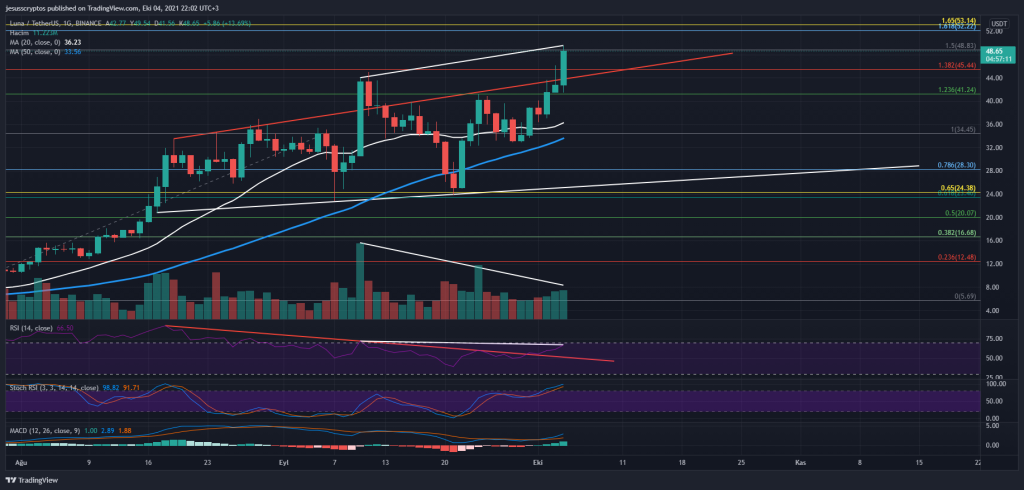 Günlük grafikte RSI göstergesi üzerindeki kırmızı düşen trendi yukarı yönlü kırmasıyla yaşadığı yükseliş sonrası fiyat tarafındaki kırmızı direnç çizgisi üzerine çıkan LUNA, an itibariyle 48,83 dolar direnciyle mücadele ediyor.