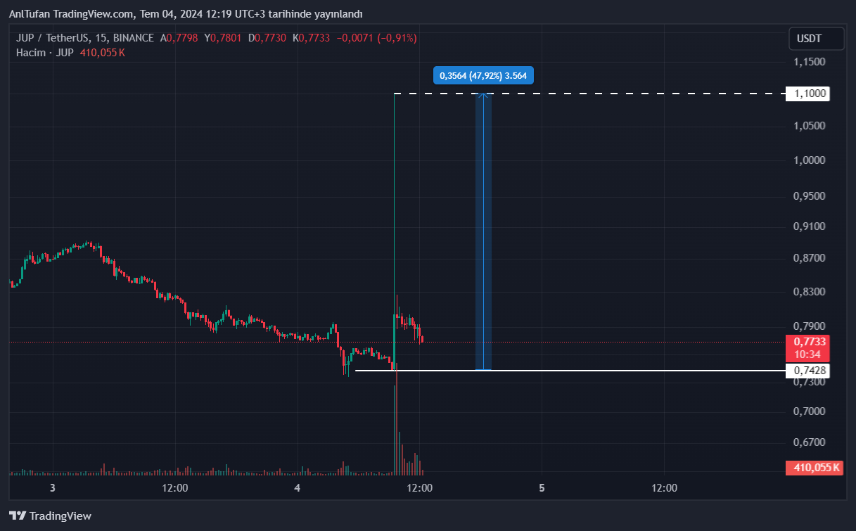 Gelen bilgilere göre Upbit, kısa bir süre sonra Jupiter (JUP) isimli altcoin’i listeleyecek. Bu gelişme sonrasında JUP fiyatında birkaç dakika içerisinde %50’ye yakın yükseliş meydana geldi. JUP kısa bir süre içerisinde ise yükselişlerinin büyük bir kısmını kaybetti.