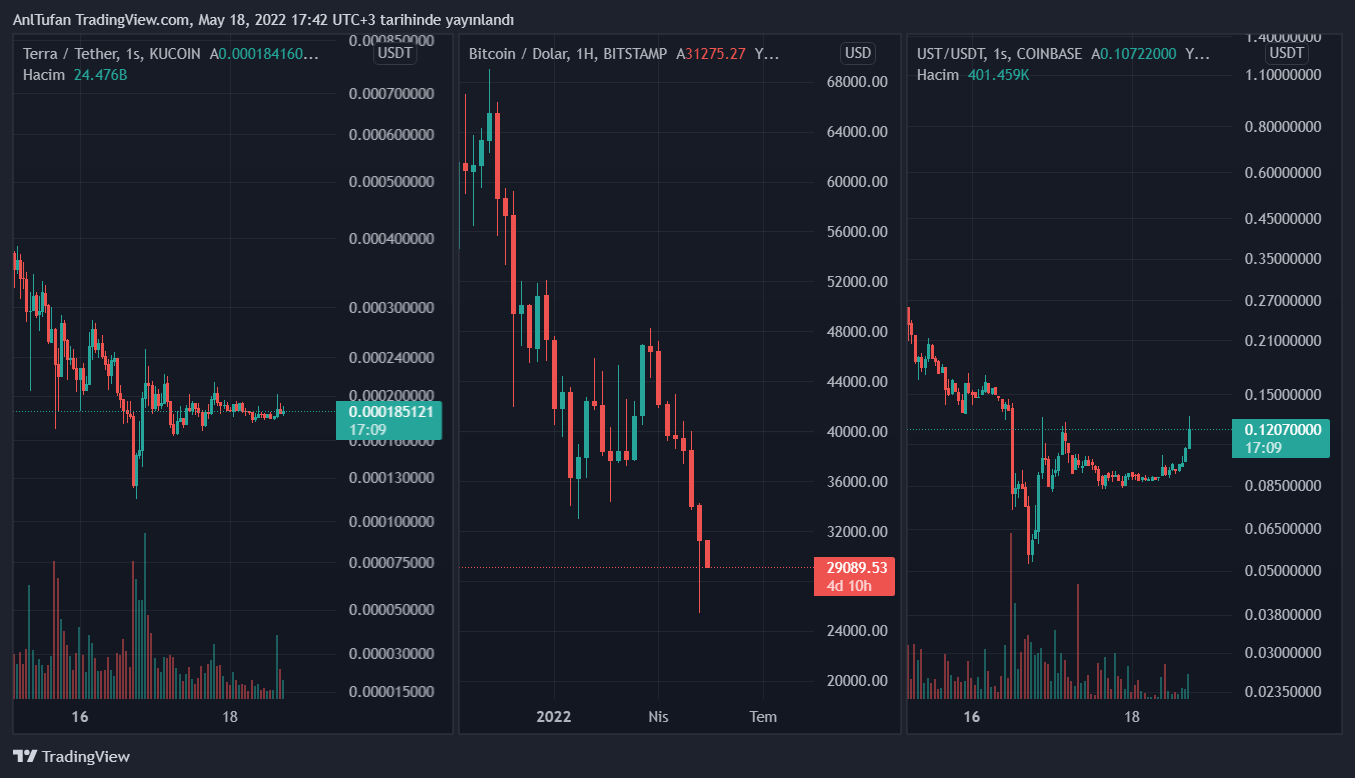 Son dakikalarda ise Bitcoin‘in düşmeye devam ettiği görülüyor. BTC ile orantılı bir şekilde ise LUNA‘nın da çöküş yaşadığı gözlemlendi.