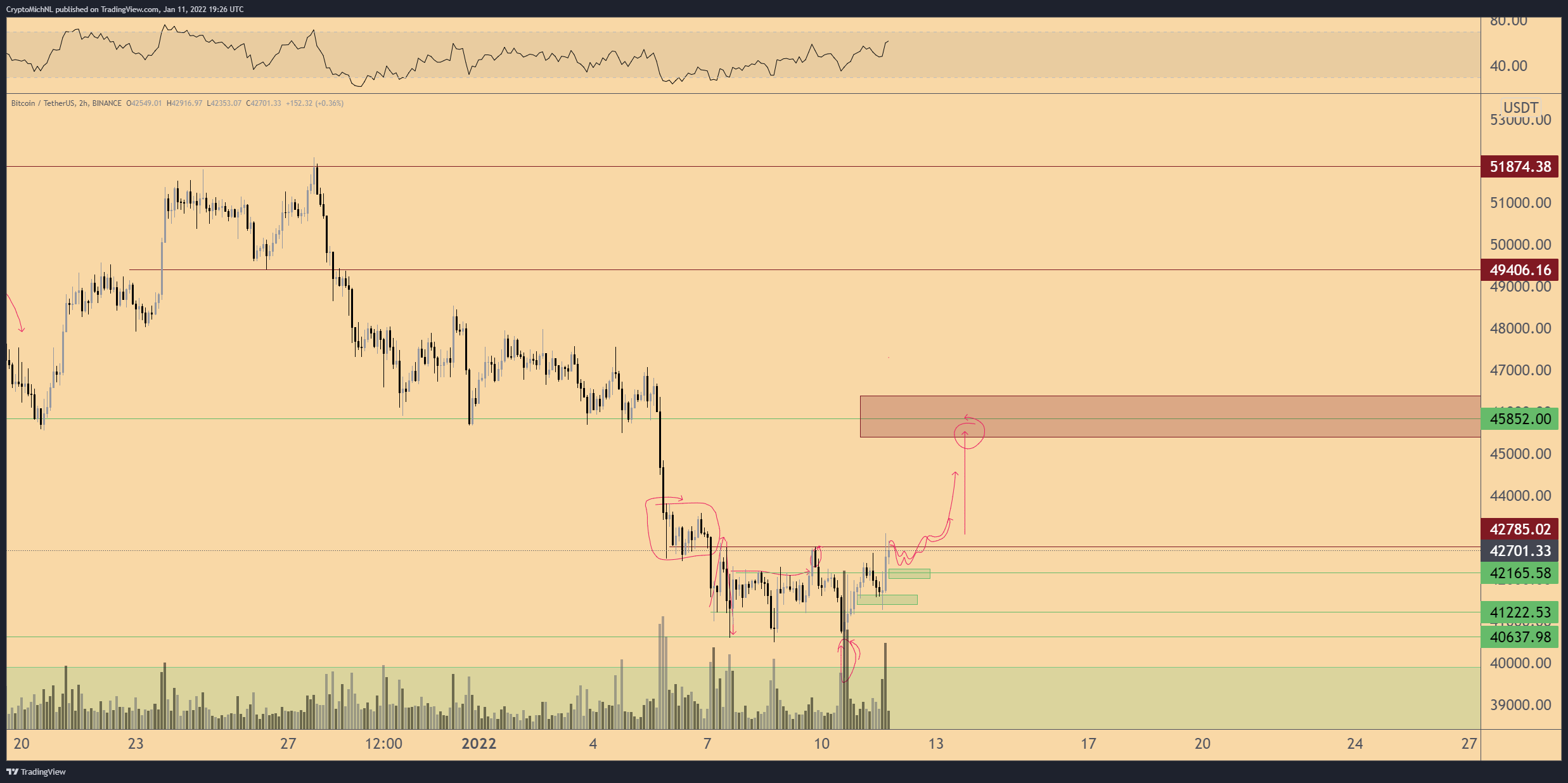 Michael Van de Poppe, 558.00 twitter takipçisi ile paylaştığı Bitcoin grafiğine atıfta bulunarak, 42.000 destek seviyesi üzerinde tutunabildiği sürece BTC için ufukta daha çok yeşil mumları görebileceğini söylüyor.