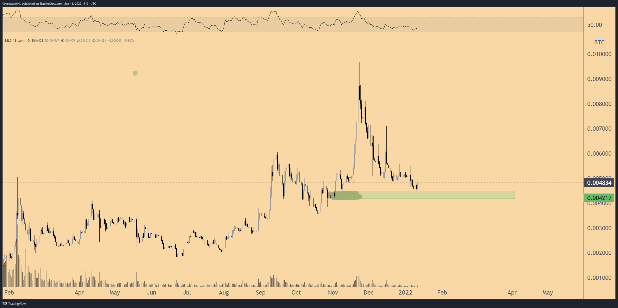 EGLD/BTC ticaret çiftinde, kurumsal düzeyde ölçeklenebilir blok zinciri platformu Elrond’u değerlendiren Poppe, altcoinin en son yaptığı büyük ralliden önce geçen yılın Kasım ve Aralık aylarında gördüğü 0.004217 ile 0.004834 aralığını vurguluyor.