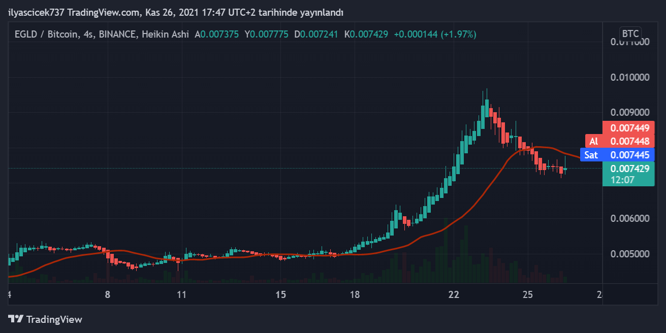 Analiste göre EGLD/BTC grafiğine bakıldığında bir düzeltme sonrası fiyatlar 0.005 BTC (291 dolar) ve 0.006 BTC (349 dolar) aralığında bir alım fırsatı vereceğini öngörüyor. Bu fiyat aralığının üzerinde almanın stratejik olarak doğru olmadığını vurguluyor. EGLD yayın saati itibari ile 403 (0.0074 BTC) dolar seviyesinde işlem görüyor.