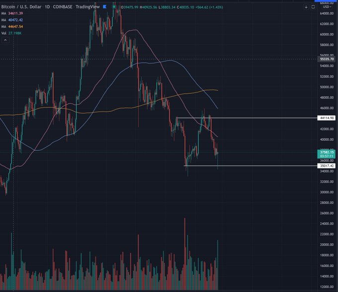 Bir diğer kripto para analisti Smart Contracter 211.000 Twitter takipçisine, Bitcoin’in şu anda 35.000 dolar ile 44.000 dolar arasında geniş bir konsolide alanı oluşturduğu söylüyor.