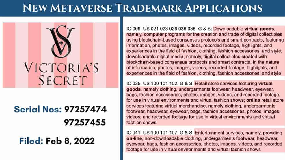 ”Victoria’s Secret metaverse geliyor! 8 Şubat tarihinde yapılan ticari marka başvurularının, blockchain teknolojisi, çevrimiçi giyim ve NFT ile oluşturulan dijital koleksiyonlar.. ayrıca sanal ortamlarda kullanılmak üzere iç giyim marka tescil başvurusu yapıldı.”