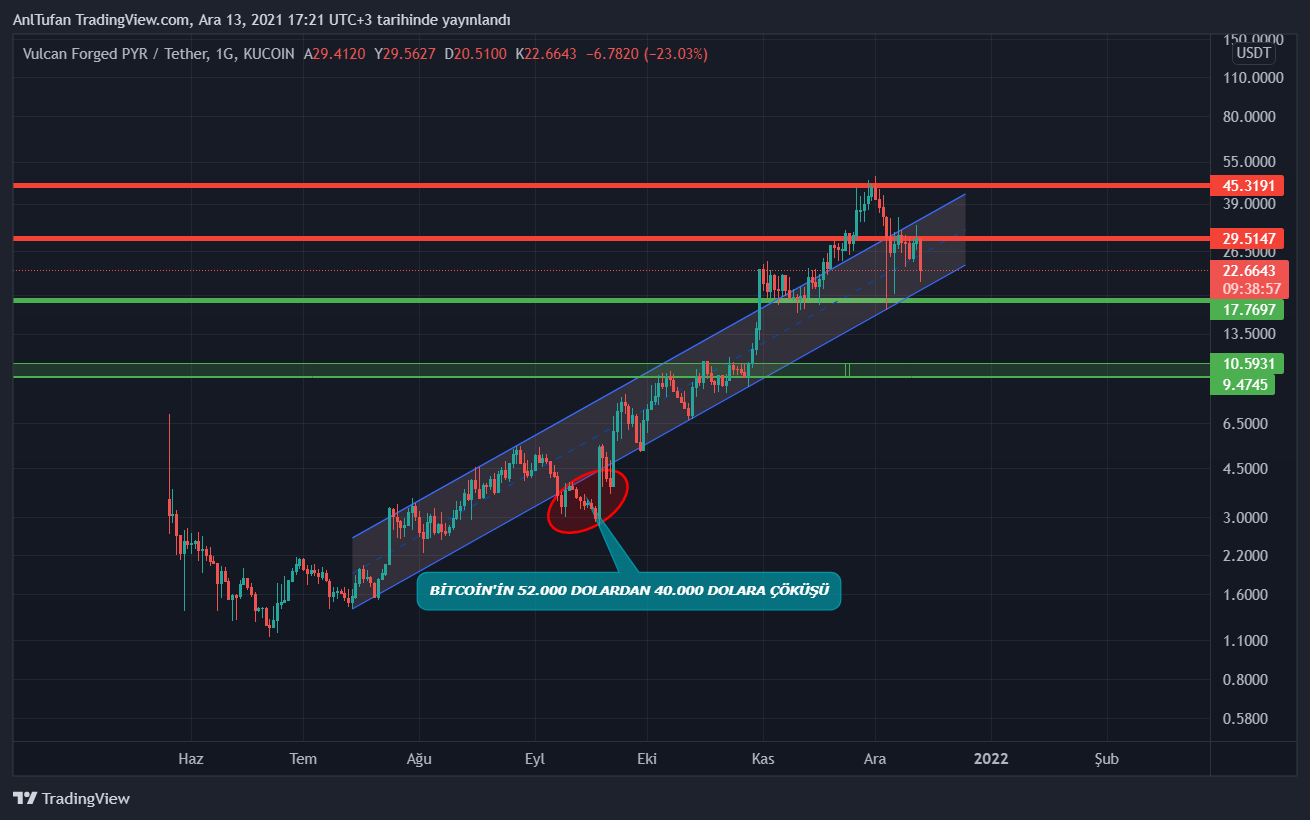Grafiğimizde de belirttiğimiz gibi kanal altına sarkmış olduğu dönemde, BTC’nin sert düşüşünün etkisi bulunuyor. Tekrarda paralel kanalın alt bandına doğru gerilemeye başlayan PYR, yatay desteği olan 17.7 dolarla kanalın alt bandından destek alması bekleniyor.