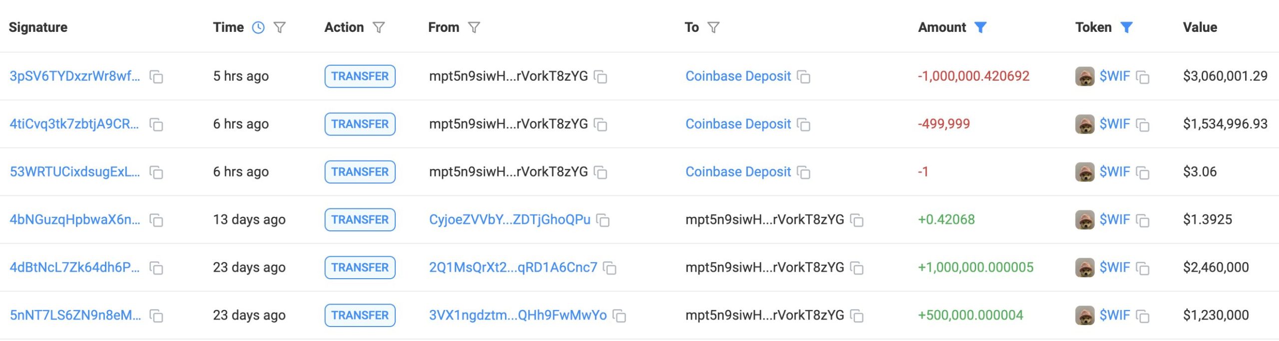 “WIF’te 8,6 milyon dolar (7.439x) kar elde eden blockgraze isimli memecoin tüccarı, 8 ay tuttuktan sonra 1,5 milyon adet WIF’in (4,56 milyon dolar değerinde) tamamını satış yapmak için Coinbase’e yatırdı.