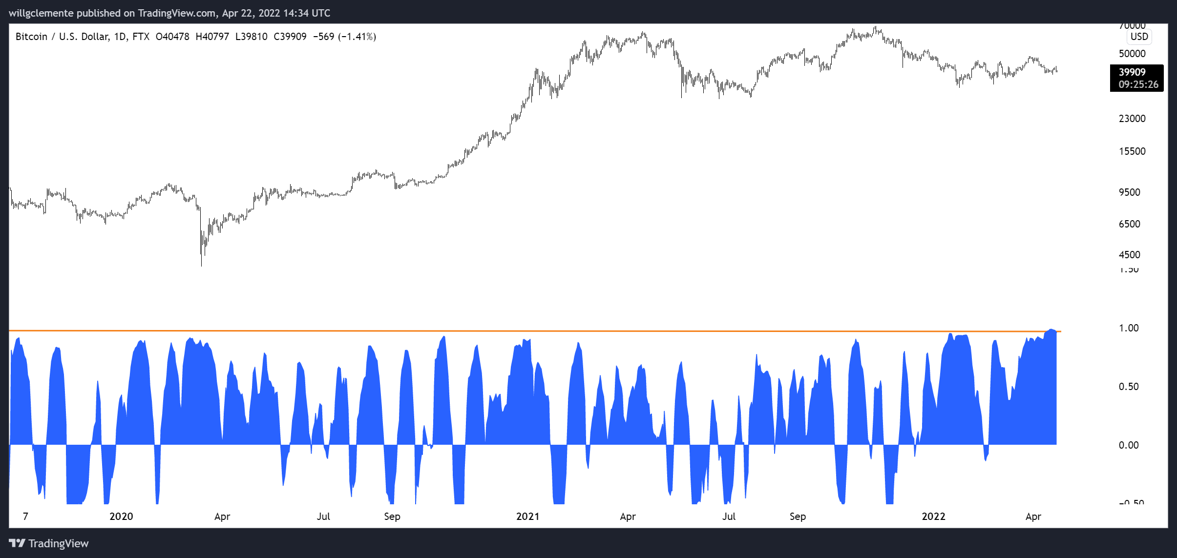 “Aşağıda BTC ile Nasdaq arasındaki 1 günlük korelasyonunun 0.98’e kadar ulaştığını görebilirsiniz.”
