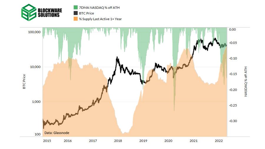 Kanıt olarak is Clemente, bir yıl içinde hareket etmeyen Bitcoin cüzdan yüzdesinin Nasdaq ile arasındaki devasa farkların olduğunu gösterdiğini bir grafiği öne sundu.