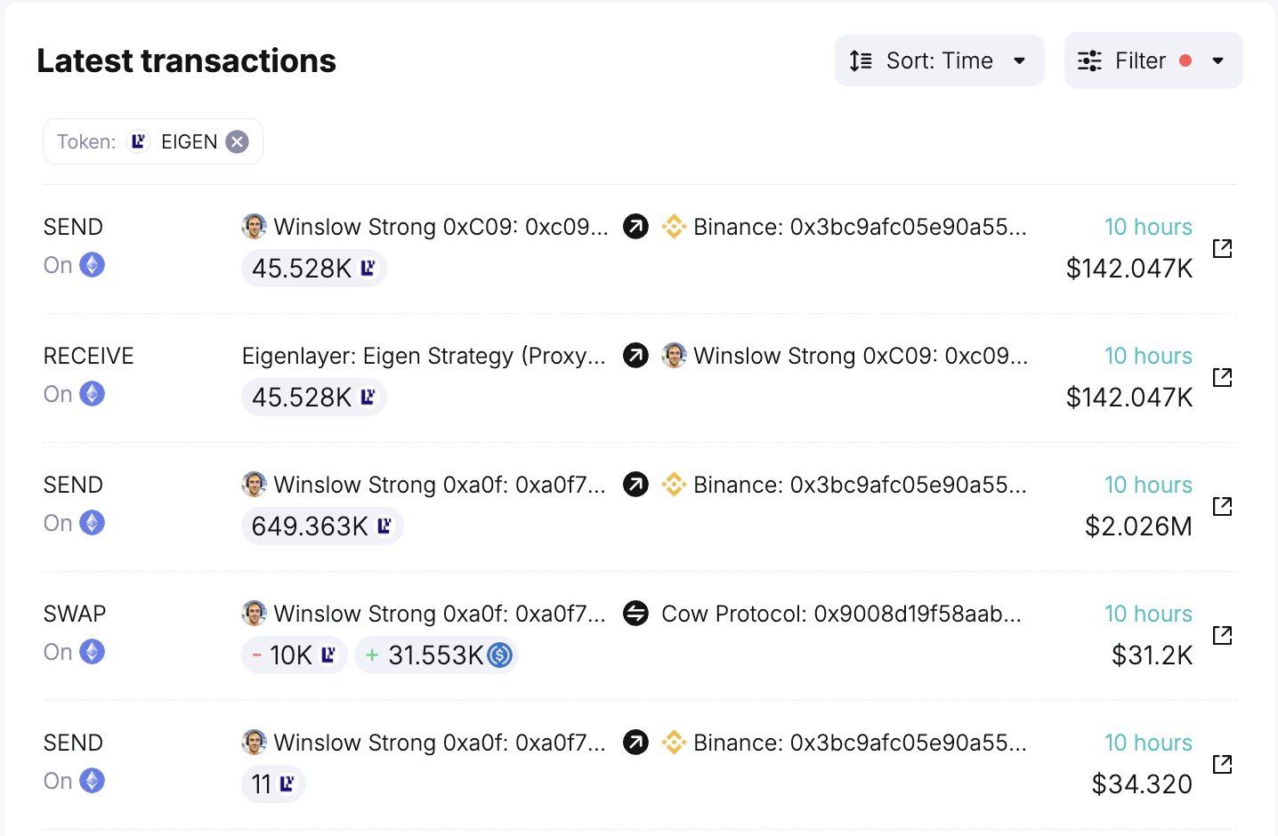 Başarılı bir zincir içi veri sağlayıcısı olan Spot On-Chain, Qualia Araştırma Enstitüsü müdürü Winslow Strong’un Binance‘de listelenmiş bir altcoin olan EigenLayer‘da (EIGEN) satış yaptığını tespit etti.