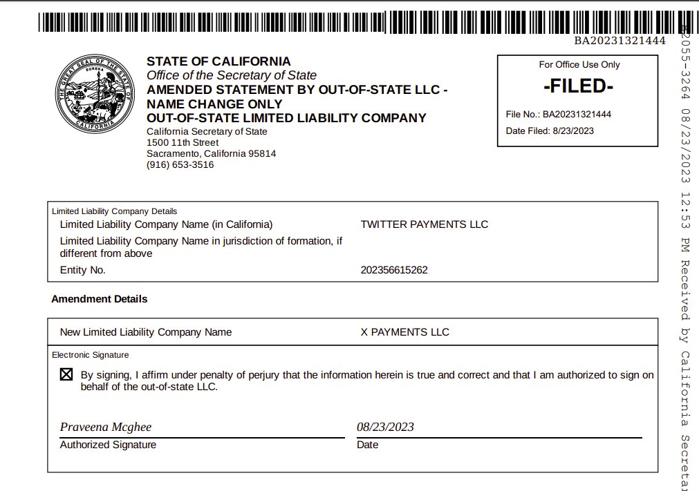 Bugün itibariyle işe X hakkında yeni belgeler ortaya çıktı. Son gelen bilgilere göre Elon Musk 23 Ağustos tarihinde Twitter Payments lisanslardaki ismini X Payments olarak değiştirdi.