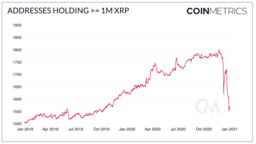 Coin Metrics tarafından 21 Aralık 2020 ve 3 Ocak 2021 tarihleri arasında arasındaki veriler hesaplandığında, en az 1 milyon XRP’ye sahip cüzdan adreslerinin 1.721’den 1.567’ye düştüğü tahmin ediliyor.