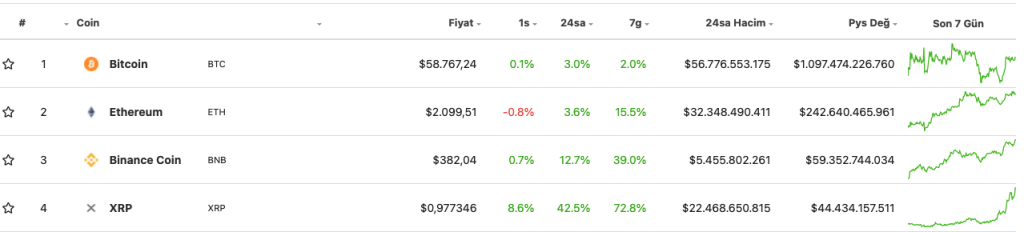 5 Nisan tarihinde toplam piyasa değerine göre en büyük 7. kripto para birimi konumundaki XRP, artık 4. kripto para birimi sıralamasına yükseldi. XRP fiyatının son 24 saat içerisinde %42 yükseliş elde ettiği ve toplam piyasa değerini 44 milyar dolara kadar çıkardığı görülüyor.