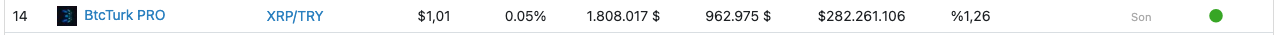 Binance kripto para borsasında basın saati itibarıyla 0,98 doları gören XRP, küresel çapta ise birçok borsada 1 dolar direncini kırıp geçti. XRP fiyatının BtcTurk Pro üzerinde de 1 dolar seviyesinin üzerine çıktığı görülüyor.