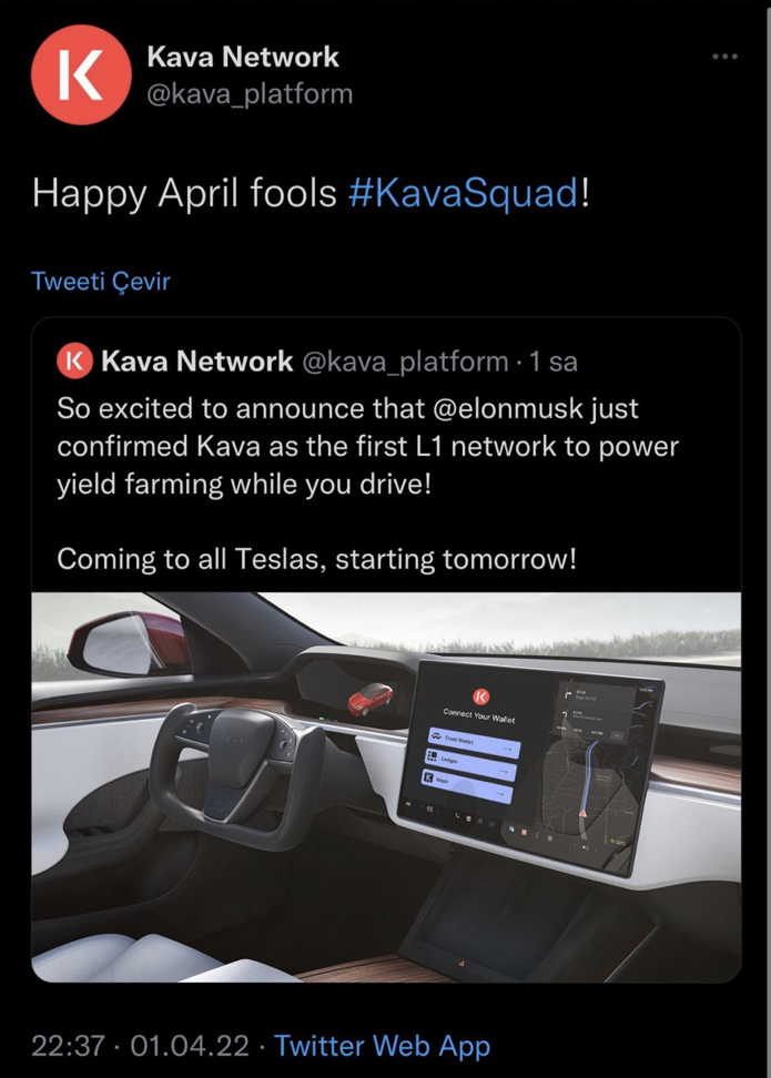 Resmi Twitter hesapları üzerinden Tesla ile anlaşma yaptıklarını aktaran Kava ekibi, artık ünlü elektrikli araba üreticisi Tesla’nın araçlarında Kava’nın altyapısının kullanılacağını duyurmuştu.