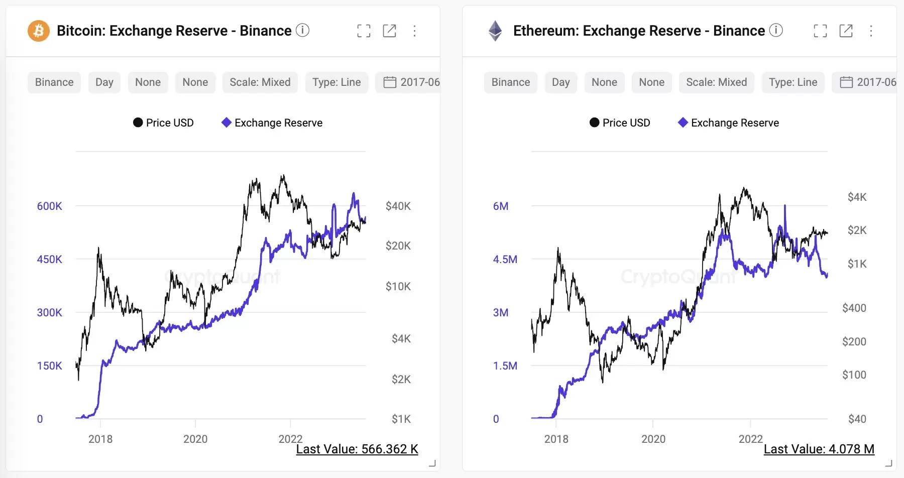 Binance borsasının Bitcoin ve ETH rezervlerine baktığımızda, kripto para yatırımcılarının Binance’in iflas edeceğine dair herhangi bir düşüncesi bulunmamakta.