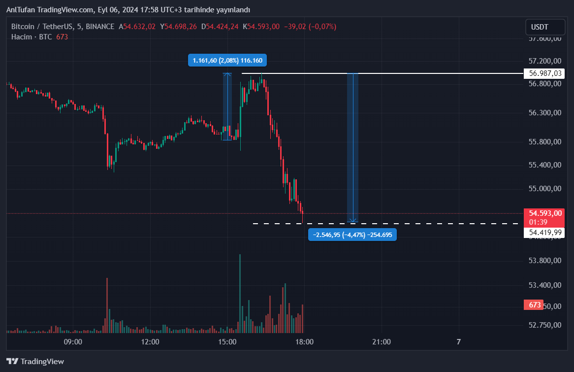 Bitcoin son satış baskısı ile birlikte 54.400 dolara kadar gerilemiş durumda. BTC’de kısa bir süre içerisinde yaşanan bu %4’lük sert düşüş, tüm kripto para sektörünü etkisi altına aldı.