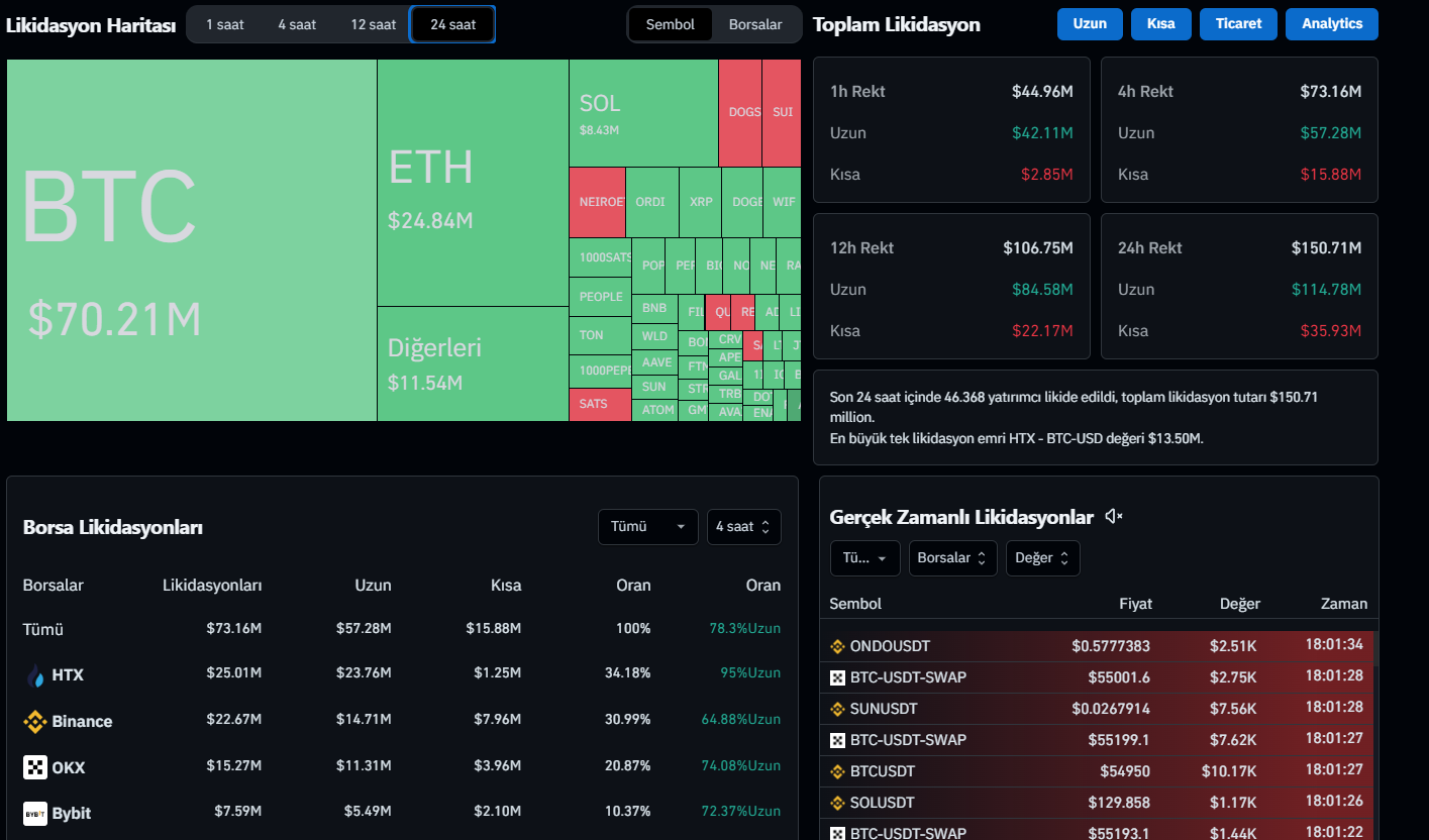 Başarılı veri sağlayıcısı olan CoinGlass‘ın aktardıklarına göre bugün toplamda 150 milyon dolarlık likidasyon meydana geldi. Bu likidasyonun 114 milyon dolarlık kısmını ise long pozisyonlar oluşturuyor.