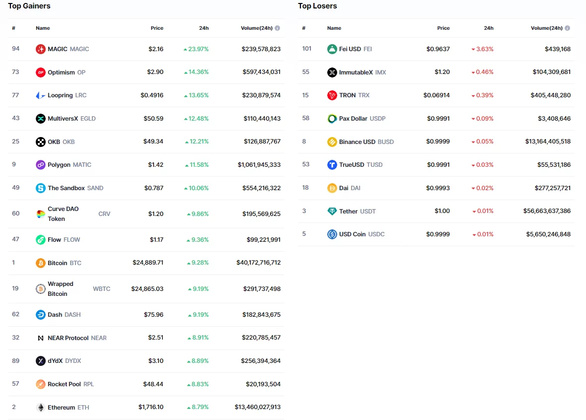 Son 24 saat içerisinde en fazla yükseliş yaşayan kripto para birimlerine baktığımızda Bitcoin’in listenin orta sıralarında olduğu görülüyor. Normal şartlarda BTC’nin bu denli büyük yükselişlerinde genel olarak altcoin’lerin yüzde 20’den fazla değer kazanması gerekirdi.