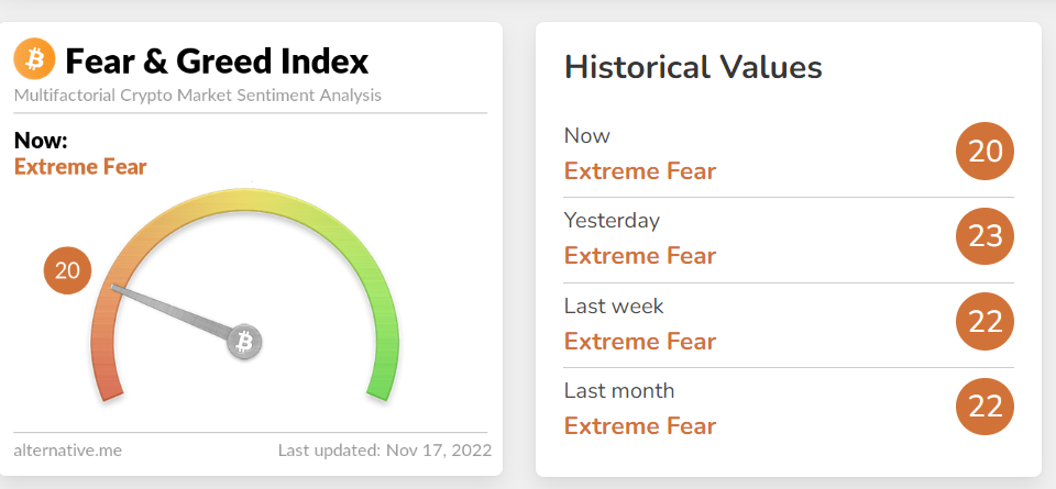 Kripto korku ve açgözlülük endeksine baktığımızda, uzun bir süredir aşırı korku seviyesi olan 20 puanda konumlandığı görülmekte.