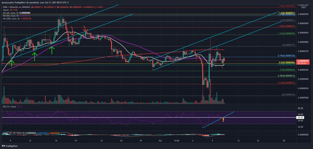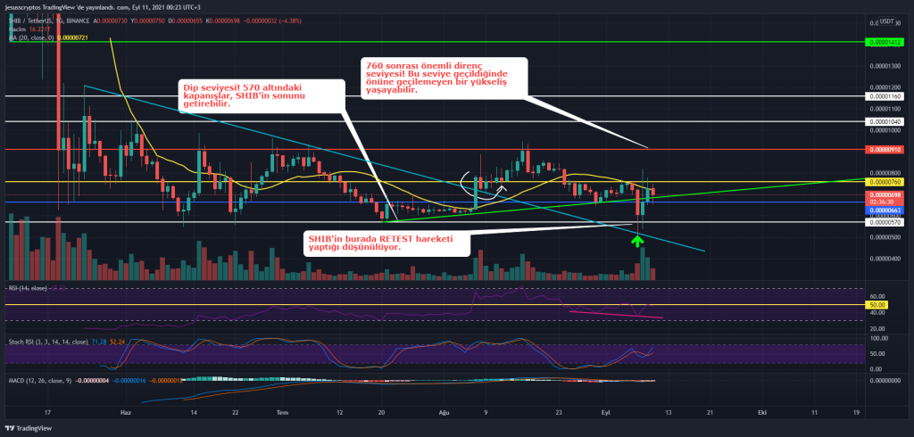 Fiyatın daha önce her geldiğinde yükseliş yaşadığı 570 seviyesinin SHIB için önemli olduğu ve bu seviye altında coinin bir yıkıma uğrayabileceği belirtiliyor. Şimdilik bu seviyeden gelen alımlarla yeşil trend çizgisi üzerine çıkan SHIB, 20 günlük hareketli ortalama olan 721 seviyesini geçmeyi başaramasa da yatırımcılarına umut veriyor.