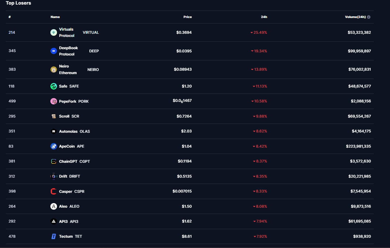 Başarılı veri sağlayıcısı CoinMarketCap’in aktardıklarına göre ilk 500 kripto para birimi içerisinde son 24 saat özelinde en çok düşüşü %25 ile birlikte VIRTUAL isimli altcoin gerçekleştirdi.