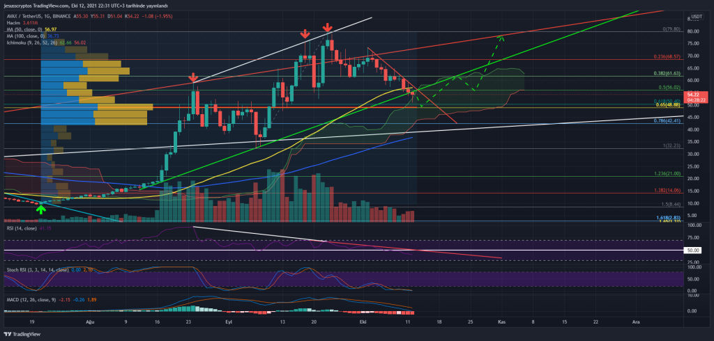 Bu noktada MA50 seviyesi olan 56,97 doları kaybettiği görülen AVAX’a Ichimoku bulutu ve fibonacci golden pocket alanı olan 48,88 – 50,40 dolar aralığı destek oluyor. Ayrıca grafikteki rallinin başlangıcından uygulanan hacim profili de bu golden pocket alanının fiyat için oldukça kuvvetli bir destek olduğunu gösteriyor. Yani bu seviyelerden daha fazla bir düşüş yaşamayacağı düşünülen AVAX’ın kırmızı düşen trendi kırarak yükselmesi ve 56,02 – 61,63 – 68,57 dolar dirençlerine gitmesi bekleniyor.