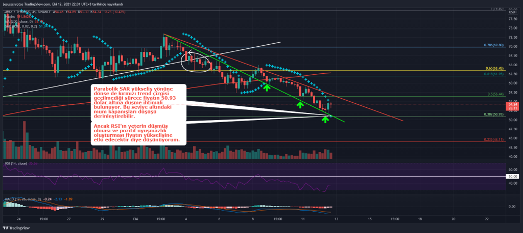 4 Saatlik grafik açısından önemli olan MA200 (62,79 Dolar) seviyesini kaybettiği görülen AVAX, fibonacci 0.382 (50,93 Dolar) seviyesinden kuvvetli bir destek bularak yükseliş yaşıyor.