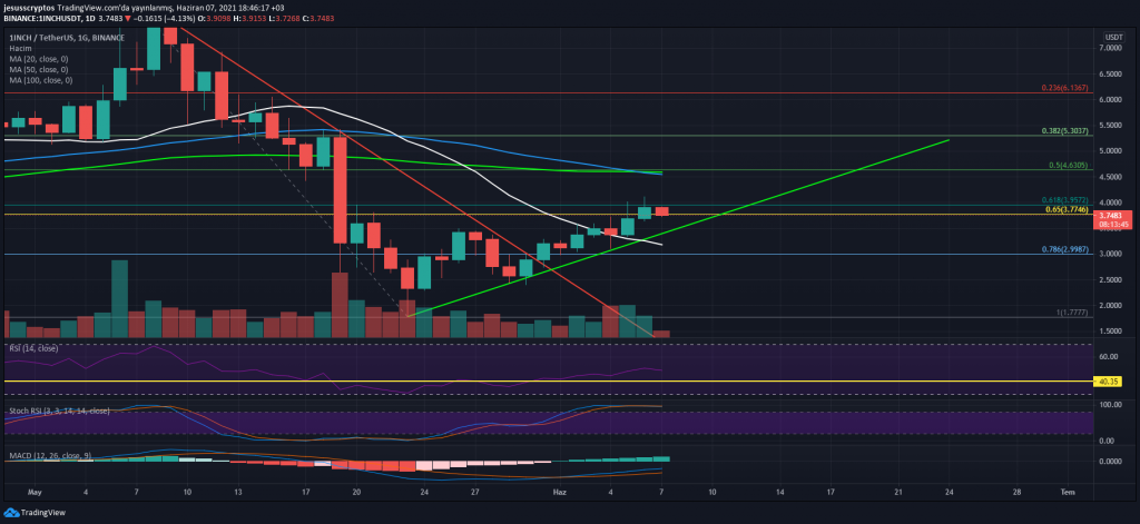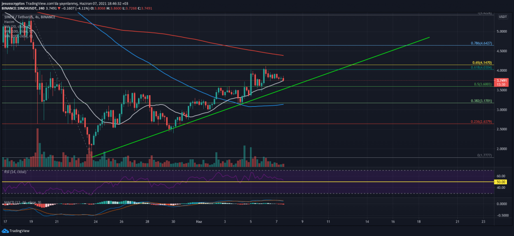 İyi bir yükseliş trendi yakaladığı görülen 1INCH, 4 saatlik grafikte çizilen fibonacciye göre 4.03 – 4.147 dolar aralığında karşılaştığı direnç ile düşüş yaşıyor.