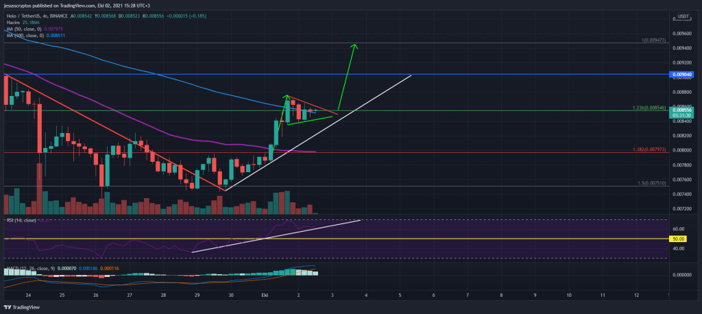 Günlük grafikteki negatif işaretlerin dışında 4 saatlik zaman diliminde HOT fiyatını değerlendirdiğimizde klasik bir boğa flaması formasyonu dikkat çekiyor.