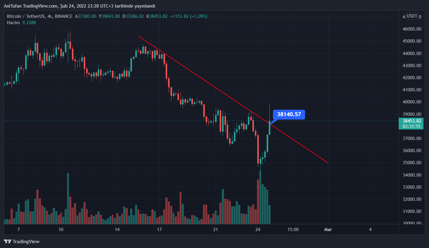 Bitcoin, 38.100 dolar üzerinde yapacağı kapanışlarla birlikte düşen trendini kırmayı başaracak. Halen Bitcoin ve kripto paralar güvenli seviyelerde olmasa bile kaos ortamlarından beslenmeye devam ediyor.